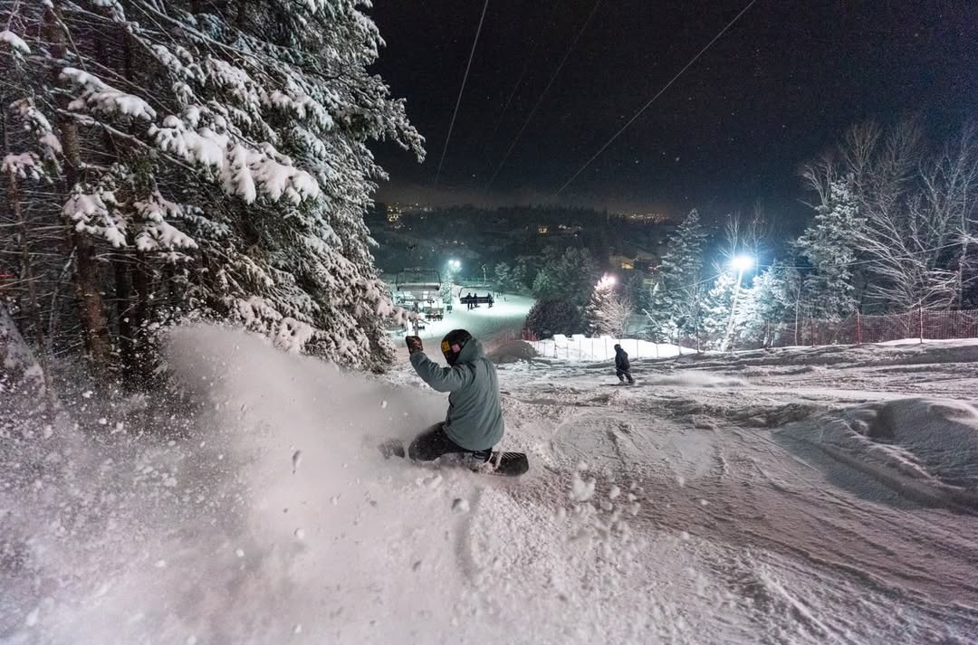 The sun still sets early —even though we’ve been gaining minutes of light and sunshine every day since the winter equinox— so, of course, Sommet Saint-Sauveur stays open after nightfall (which comes early). Skiing is available until 10:30 p.m., conditions permitting, for those who aren’t too cold, and starting at 8:30 a.m. in the morning.