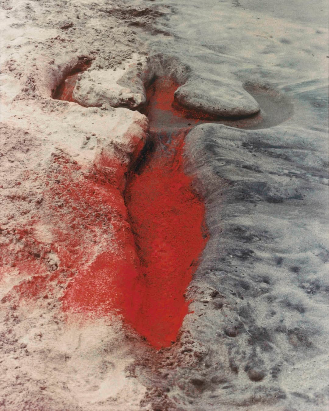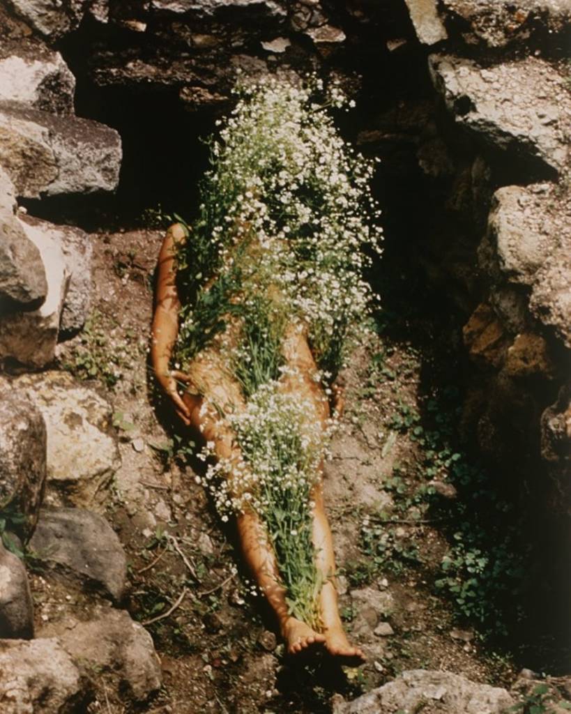 Under the ground, under the rain, under the ocean, in the clouds—the mental journey conjures images that flash between something cartoonishly miraculous like Fantasia 2000 (1999) and an Ana Mendieta series. The Cuban-American artist, known for her “earth/body” sculptural and performance art, has placed herself in situations of returning to the earth and her works are like a primal whisper. Naked in a stream, leaving red marks on rocks, or leaving an imprint of fire in the rain.