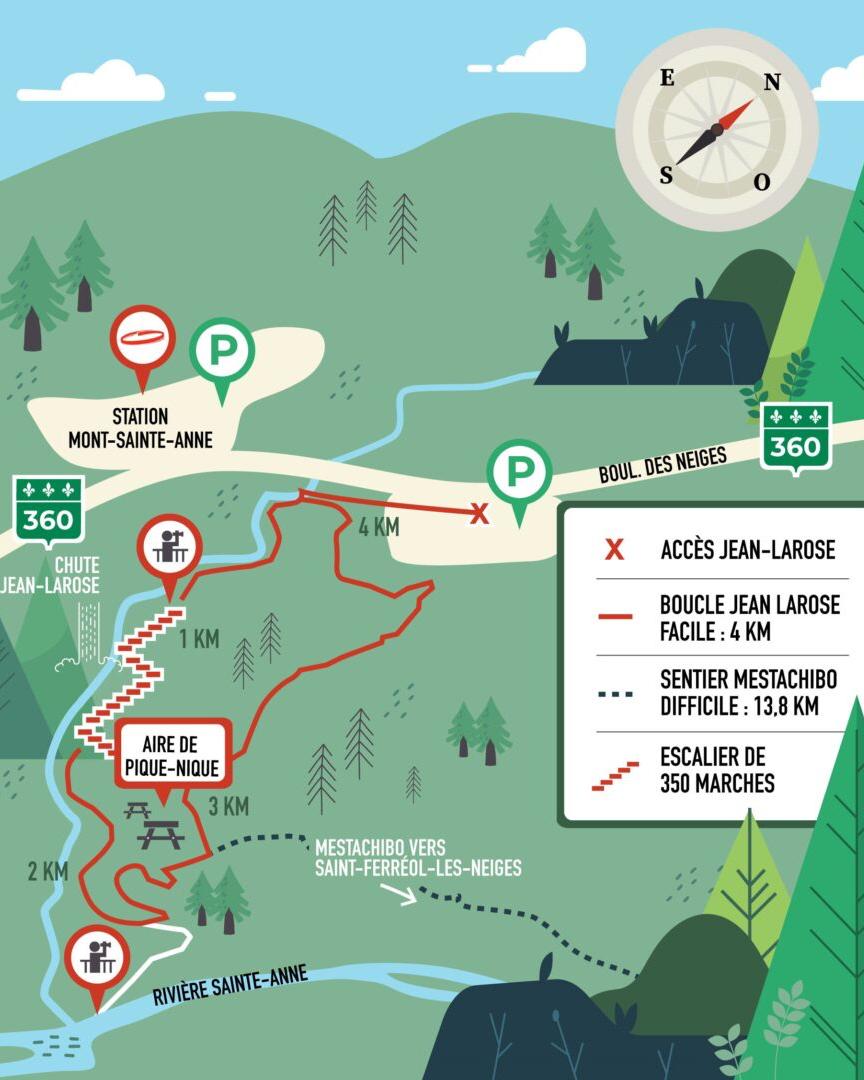You can walk in several areas that are suitable for hiking, and in the Jean-Larose area you can walk 4 km (loop) and climb 400 steps—weather permitting—to a beautiful waterfall that freezes in winter and creates supernatural and very poetic shapes that are beautiful to photograph.