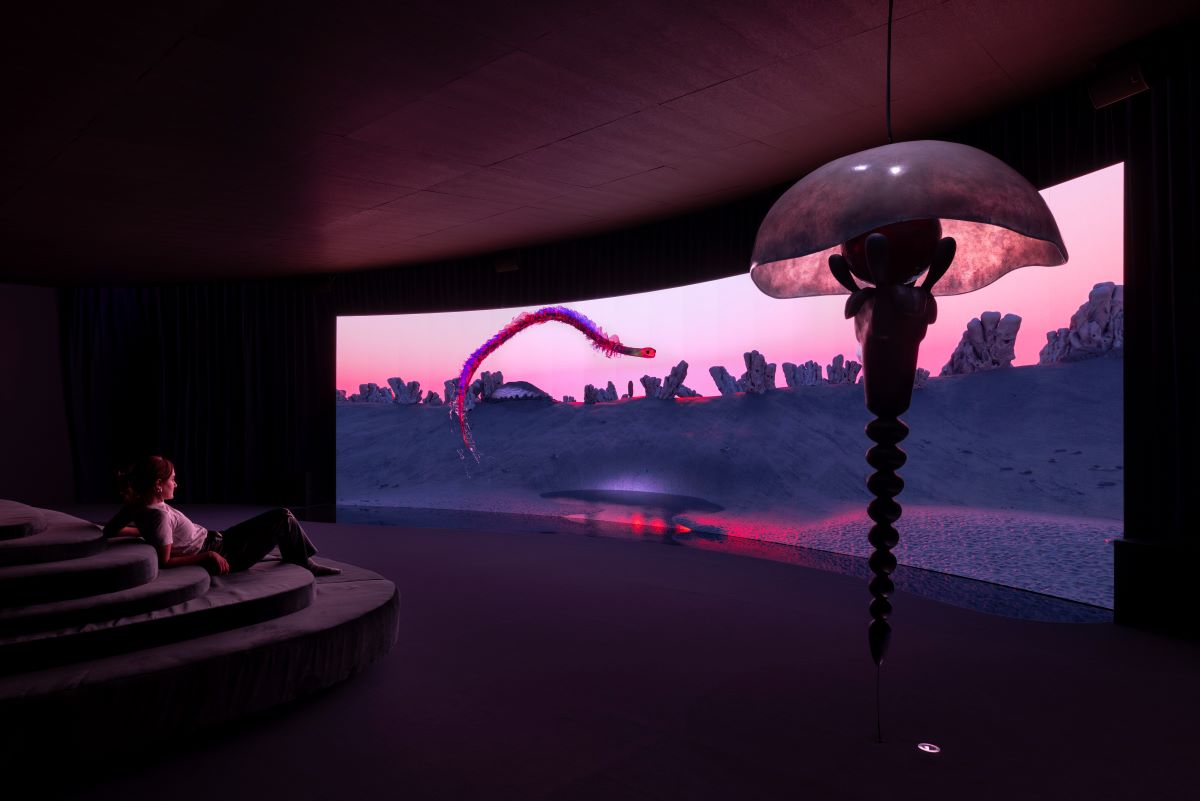 The 23-minute video at the center of the installation unfolds what Josèfa calls a “science-fiction ecosystem”, a creative myth without beginning or end – in continuous metamorphosis. The music that accompanies the psychedelic images, composed by Fatima Al Quadiri, gives the film an aura of timeless legend.